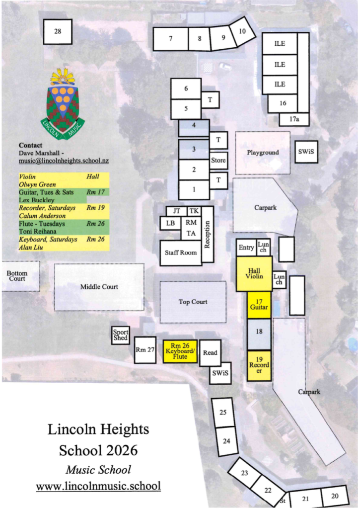 Violin and viola lessons are in the Hall next to the main carpark, and Guitar lessons are in Room 17 next to the Hall. Recorder and Theory lessons are a bit farther down in Room 19. Flute and Keyboard lessons will be held in Room 26. See the campus map below.